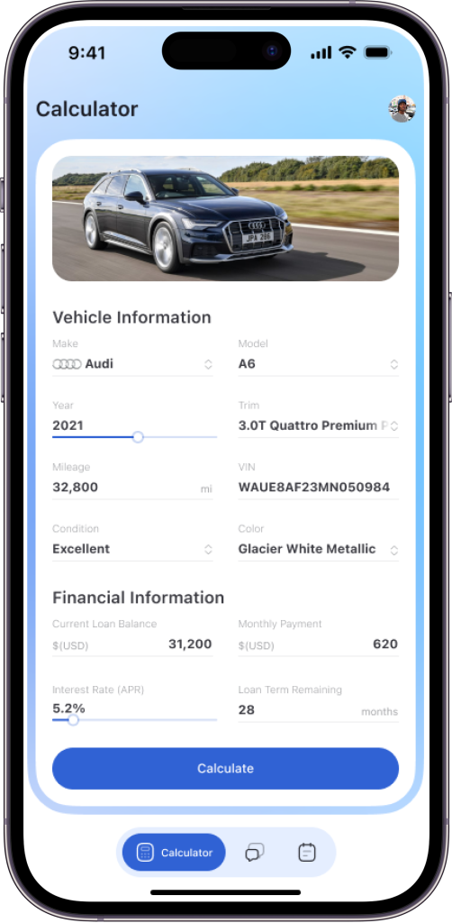 Nuestra calculadora te indica el pago real antes de acudir al concesionario. Ajusta el precio, la tasa de porcentaje anual (APR), el valor de tu vehículo usado y el plazo para ver el coste mensual exacto. Sencillo, rápido y transparente.